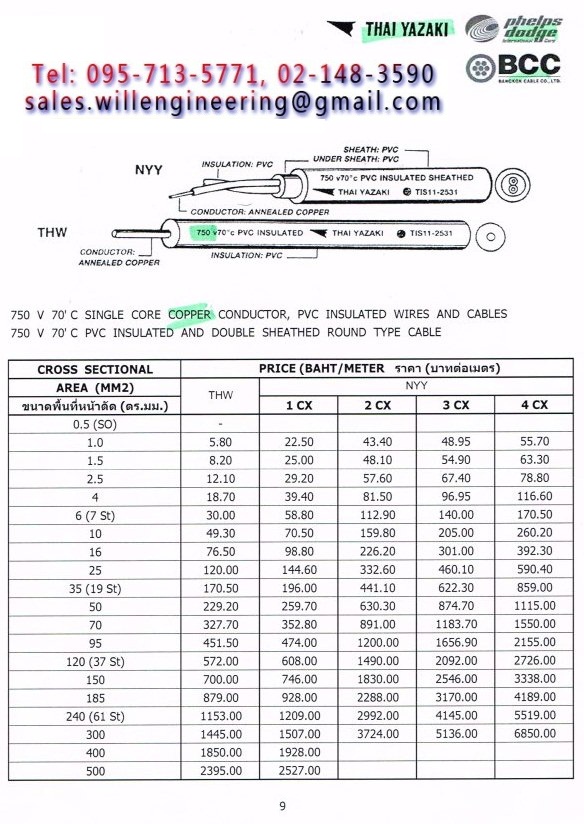 750V, 60°C-70°C, PVC INSULATED, SINGLE CORE สายไฟชนิดตัวนำเดี่ยว/สายไฟแรงต่ำใช้ภายในอาคาร |