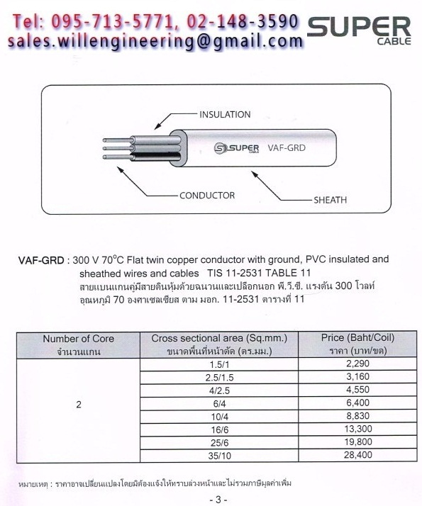 300V 70°C PVC INSULATED FLAT TWIN CABLE สายไฟแบนแกนคู่หุ้มด้วยฉนวนสำหรับเดินตามผนัง ![]() |
